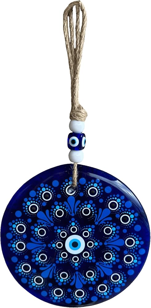 Made in Türkiye with authentic Turkish glass. Classical style Nazar amulet, 9cm diameter. Perfect as home decor, wall hanging decoration, or protection charm. Comes in gift box.